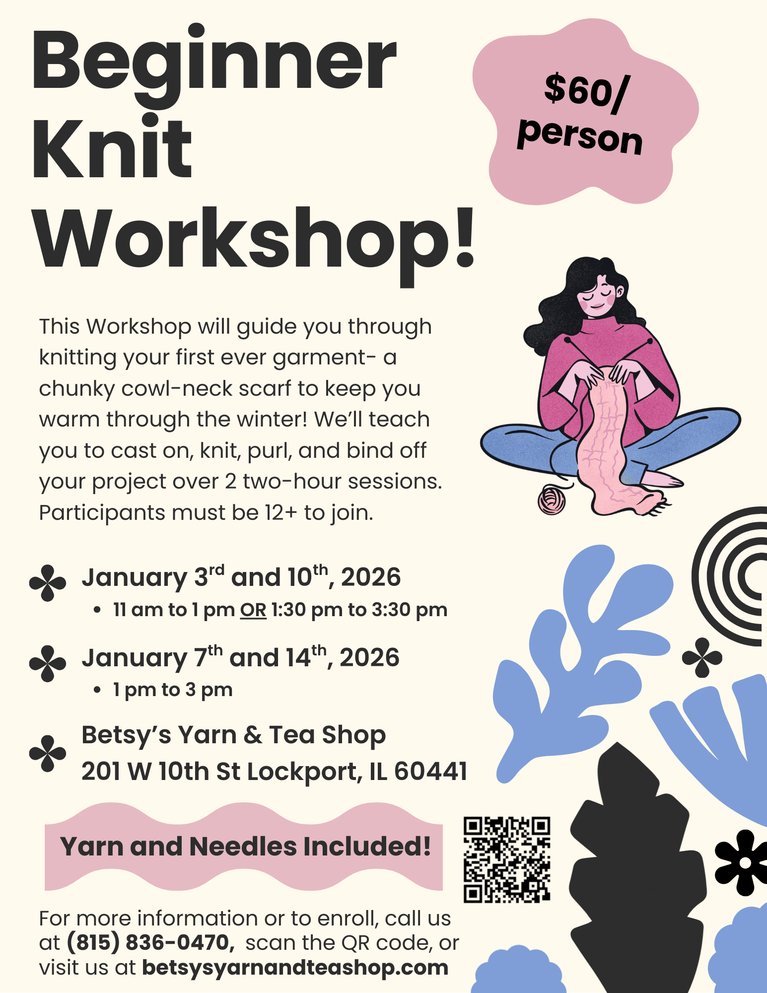 Description: The Beginner Knit Cowl Workshop will teach you how to cast on, knit, purl and bind off a chunky cowl-neck scarf in 2-hour sessions. The first session will cover casting on the project and learning the knit and purl stitches. In the next session, you’ll learn bind off and block your cowl-neck scarf! Participants must be 12 years old+. If you’re interested in classes for children, please contact us at (815) 836-0470.