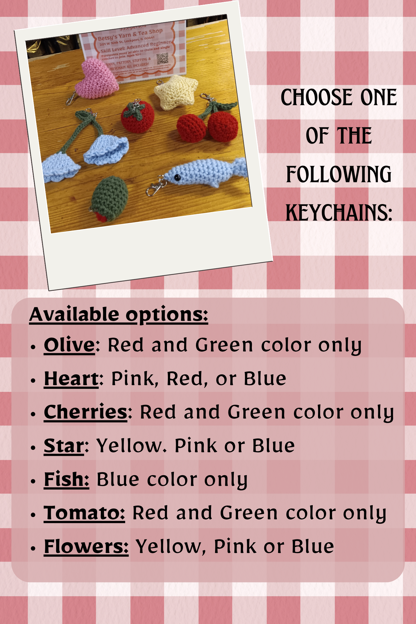 Description: The Crochet Bag Charm Workshop will guide you through creating your own fun and unique crochet keychain in one 2.5 hour session! This is the perfect workshop for adventurous beginner crocheters who only know the most basic stitches but are still looking to make something creative and exciting! The instructor will cover assist you in making one of seven bag charm options: a star, cherries, lily of the valley flowers, a sardine, an olive, a tomato, or a classic heart. Participants must be 10 years old+. If you’re interested in classes for children, please contact us at (815) 836-0470.